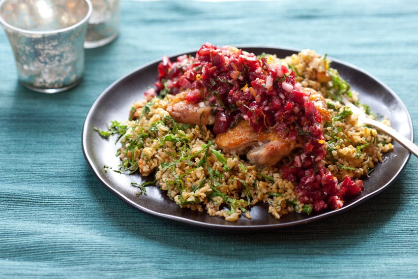 Recipe Orange Chicken Thighs With Cherry Salsa Green Wheat Freekeh Salad Blue Apron